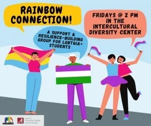Rainbow Connection is a weekly support and dialogue group providing all students an opportunity to form supportive friendships with other group members, learn resilience skills and strategies for self-care, and set goals to help you along your personal journey.